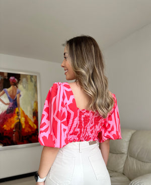 Crop top con recogido en la parte delantera graduable, manga ancha. Estampada en seda mate.