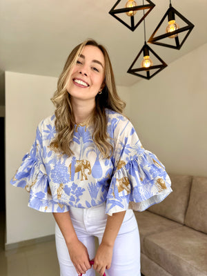 Frescura y estilo se combinan en esta hermosa blusa de mangas amplias con golas, ideal para un look elegante y relajado. Combínala con jeans, pantalones unicolor o faldas para un look impecable!
