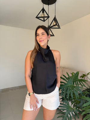 El cuello alto tipo halter estiliza el rostro y aporta un aire chic, mientras que el tejido satinado añade un brillo sutil que eleva cualquier outfit. Ideal para eventos de noche, cenas especiales o salidas con estilo.
