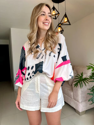 Atrévete a lucir sofisticada y con mucho estilo con la Blusa Georgina, una prenda que combina comodidad y diseño con su estampado. Su corte holgado y ligero te brinda libertad de movimiento, mientras que sus detalles cuidadosamente diseñados elevan tu look al siguiente nivel.
