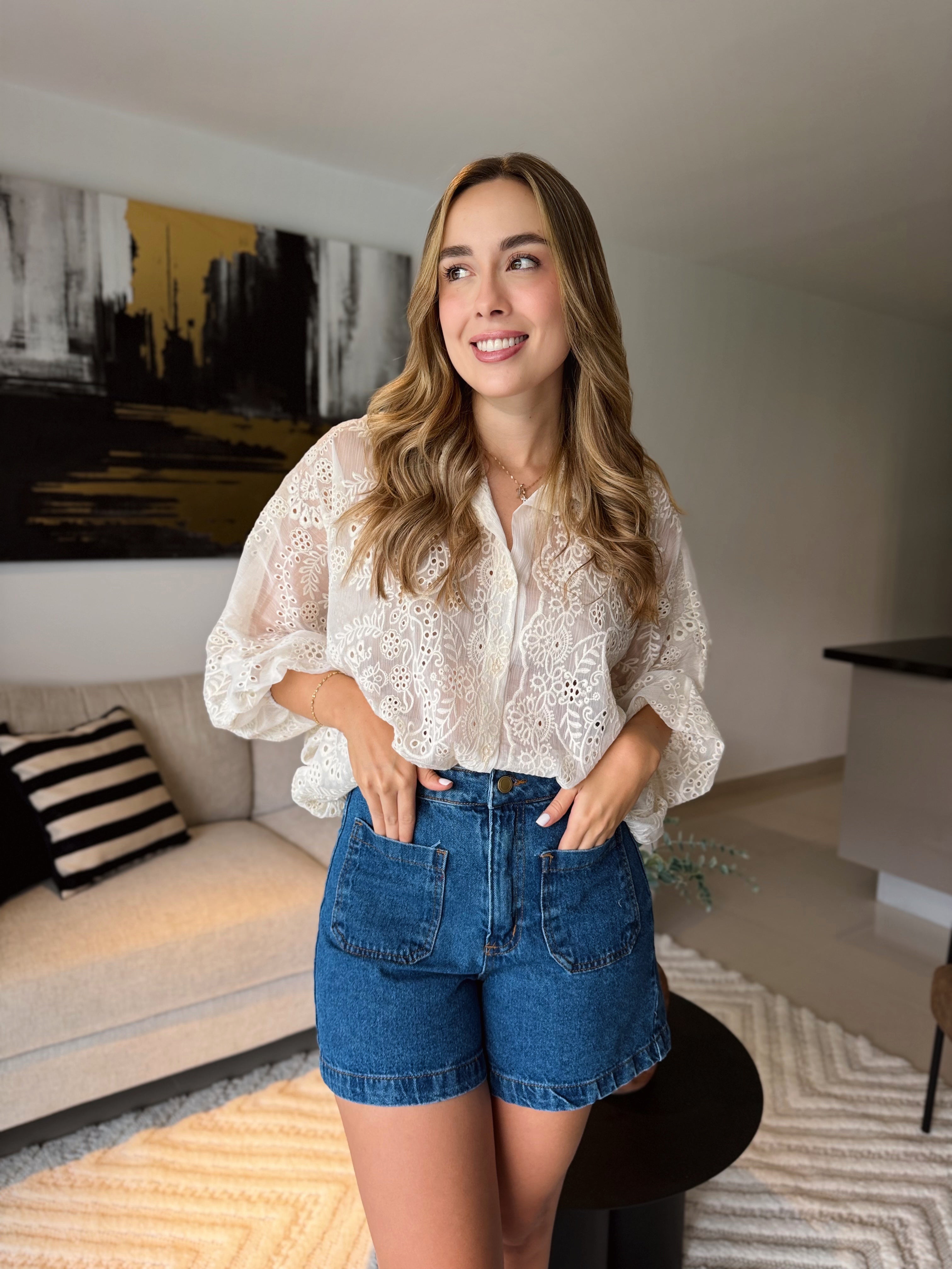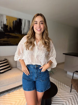 Blusa en tono blanco marfil elaborada en delicado velo tipo bordado floral, con detalles calados que aportan un aire romántico y femenino. Su diseño semitransparente le da un toque sofisticado y fresco, ideal para climas cálidos.