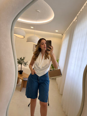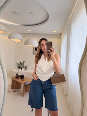 Luce sofisticada y femenina con la blusa Mykonos blanca. Su diseño con escote drapeado en el frente y espalda descubierta la convierte en una prenda ideal para destacar en cualquier ocasión. Se ajusta en la parte trasera con un elegante lazo, creando un detalle encantador que realza la figura. Perfecta para combinar con jeans, faldas o pantalones de tiro alto. Ideal para salidas de noche, cenas o eventos especiales.