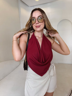 Luce sofisticada y femenina con la blusa Mykonos vino. Su diseño con escote drapeado en el frente y espalda descubierta la convierte en una prenda ideal para destacar en cualquier ocasión. Se ajusta en la parte trasera con un elegante lazo, creando un detalle encantador que realza la figura. Perfecta para combinar con jeans, faldas o pantalones de tiro alto. Ideal para salidas de noche, cenas o eventos especiales.