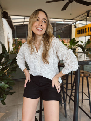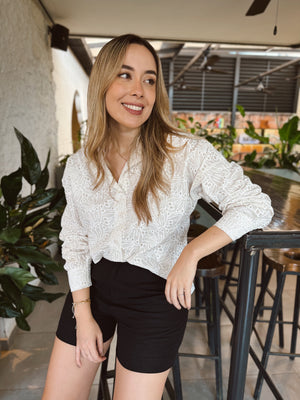 Blusa confeccionada en tela ligera con diseño en relieve que simula hojas y flores, aportando textura y sofisticación. Su silueta es cómoda y favorecedora, con mangas largas ligeramente abullonadas y puños ajustados. Cuenta con cuello camisero, botones frontales y un estilo versátil ideal para looks casuales o más formales.