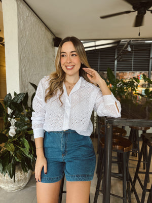 Blusa de ojalillo, confeccionada en una tela ligera, delicada y llena de detalles que aportan un toque romántico y femenino. Su silueta es cómoda y favorecedora, con mangas largas ligeramente abullonadas y puños ajustados. Ideal para looks casuales y elegantes, combina perfectamente con jeans, shorts o pantalones de vestir.