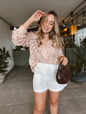 Blusa de ojalillo, confeccionada en una tela ligera, delicada y llena de detalles que aportan un toque romántico y femenino. Su silueta es cómoda y favorecedora, con mangas largas ligeramente abullonadas y puños ajustados. Ideal para looks casuales y elegantes, combina perfectamente con jeans, shorts o pantalones de vestir.