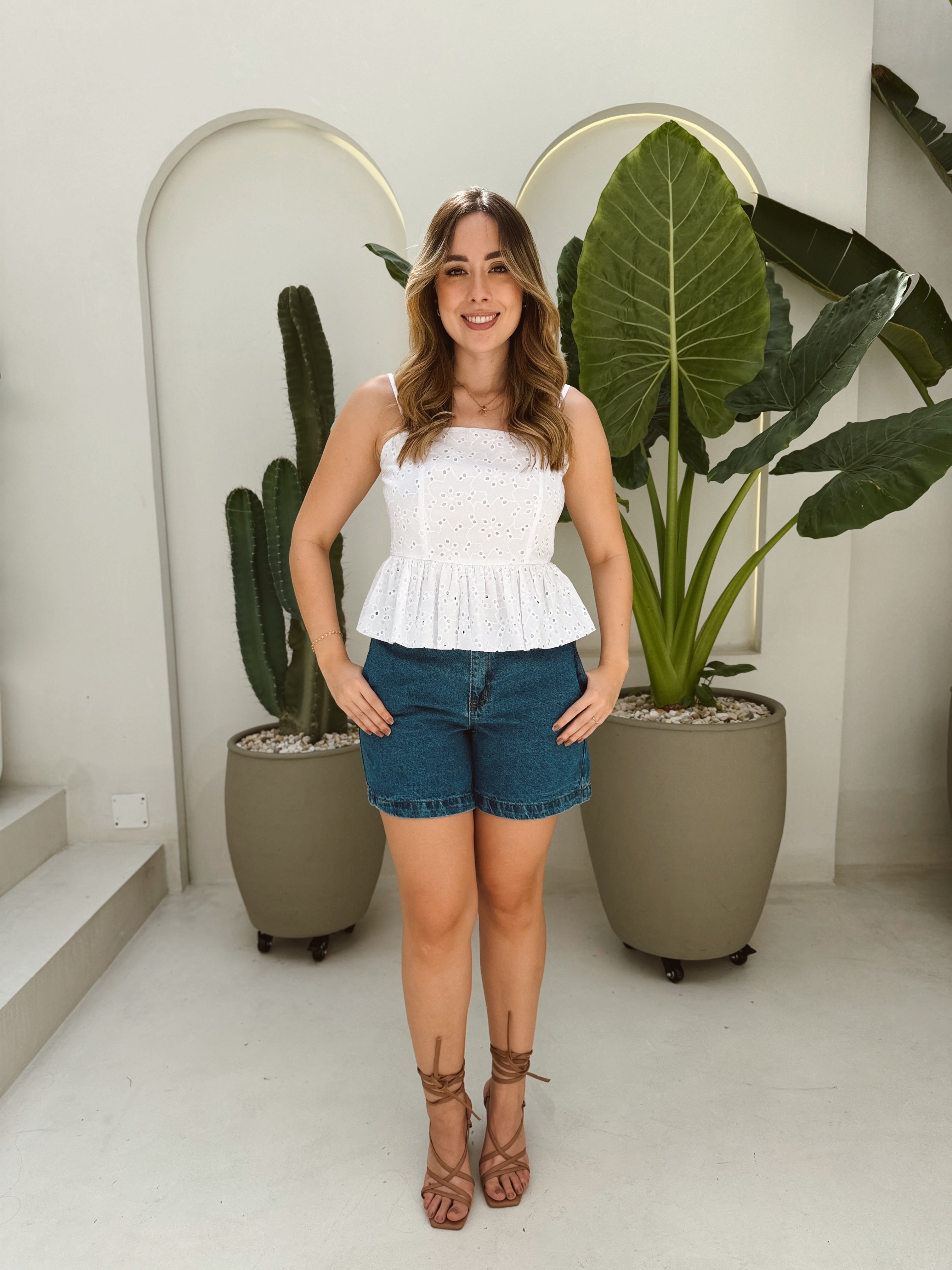 Esta blusa está confeccionada en tela de ojalillo forrado, lo que garantiza comodidad y evita transparencias mientras mantiene el estilo delicado del calado. Tiene tirantes delgados, un escote recto muy favorecedor y un diseño tipo peplum que realza la cintura con una caída suave y femenina. Cuenta con cierre trasero, que permite un ajuste perfecto al cuerpo. Es una prenda fresca, versátil y perfecta para looks casuales y veraniegos.