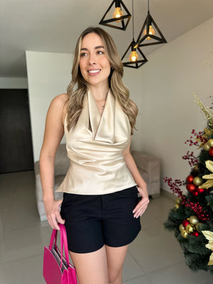 La blusa Tulum es la prenda ideal para destacar con un look sofisticado y seductor. Su diseño halter con escote drapeado realza la figura, mientras que su confección en tela satinada aporta un brillo sutil que lo hace perfecto para ocasiones especiales.