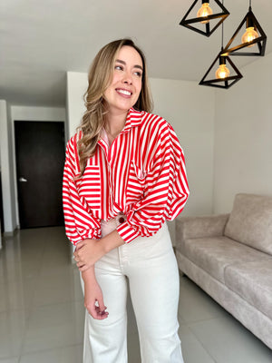 BLUSA BALI PRINT RAYAS BLANCO-ROJO