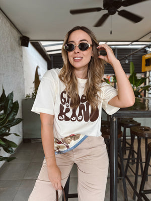 Camiseta color marfil de manga tipo Oversize con diseño estampado frontal. Su corte relajado la hace cómoda y versátil, ideal para looks frescos y modernos. Confeccionada en tela suave y ligera, perfecta para combinar con jeans, shorts o faldas en outfits casuales del día a día.