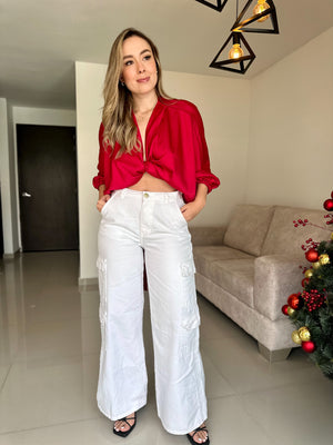Jean cargo, tela rigida 100% algodon, tiro alto, con bolsillos laterales, color blanco.