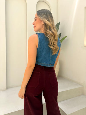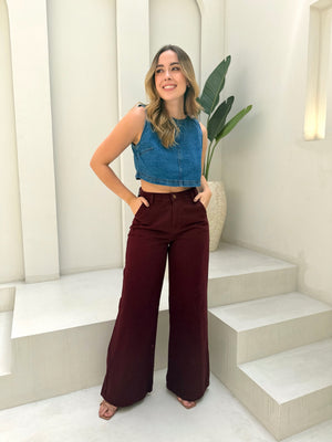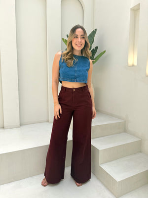 Pantalón de tiro alto en denim ligero color marrón. Su diseño de bota ancha y caída recta lo convierte en una prenda versátil, perfecta para combinar con blusas, camisetas o tops. Cuenta con bolsillos delanteros y traseros funcionales, además de cierre con botón y cremallera. Ideal para looks casuales y modernos.
