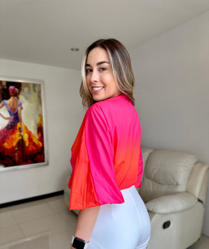 Este hermoso top es la pieza ideal para un look fresco y elegante. Su diseño de mangas amplias y fluidas le da un aire sofisticado, mientras que el nudo frontal permite un ajuste favorecedor y moderno. Está confeccionada en una seda ligera, perfecta para mantener la comodidad sin perder el estilo.