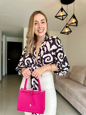 Este hermoso top es la pieza ideal para un look fresco y elegante. Su diseño de mangas amplias y fluidas le da un aire sofisticado, mientras que el nudo frontal permite un ajuste favorecedor y moderno. Está confeccionada en una seda ligera, perfecta para mantener la comodidad sin perder el estilo.