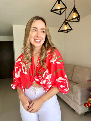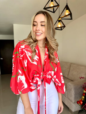 Este hermoso top es la pieza ideal para un look fresco y elegante. Su diseño de mangas amplias y fluidas le da un aire sofisticado, mientras que el nudo frontal permite un ajuste favorecedor y moderno. Está confeccionada en una seda ligera, perfecta para mantener la comodidad sin perder el estilo.