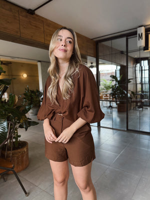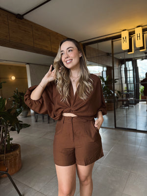 Este set consta de top cruzado con lazo ajustable y short de tiro alto destaca por su diseño moderno y versátil, ideal para cualquier ocasión. Usa el top cruzado para un look sofisticado o anúdala en la parte frontal para un estilo más relajado.