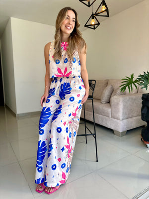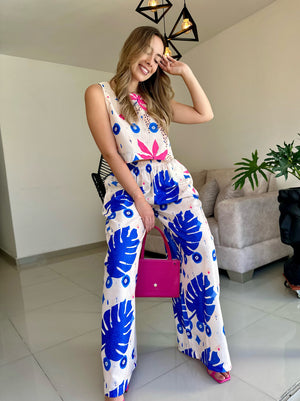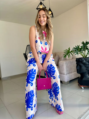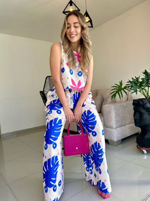 SET AMALFI PRINT HOJA AZUL Y FUCSIA