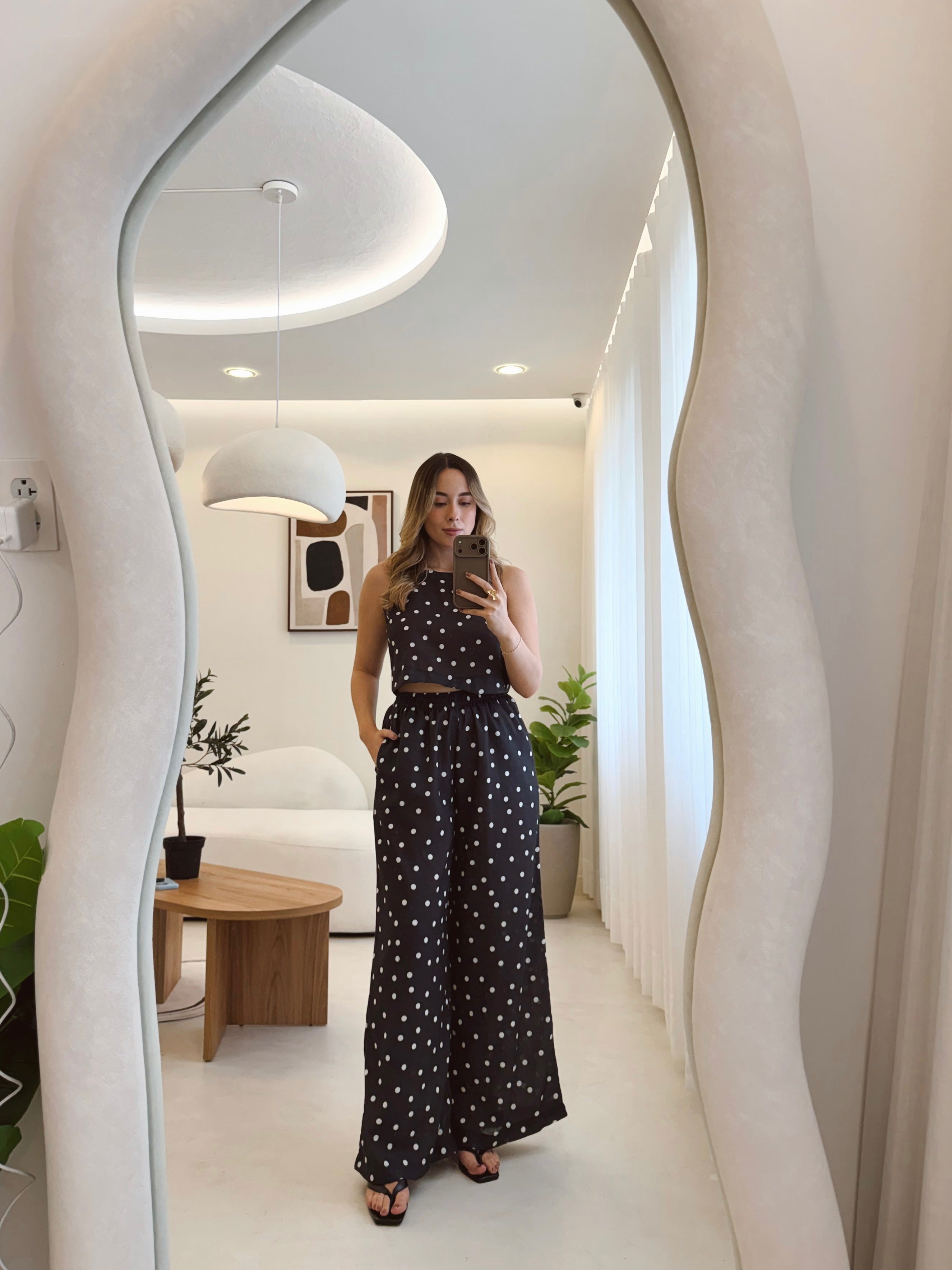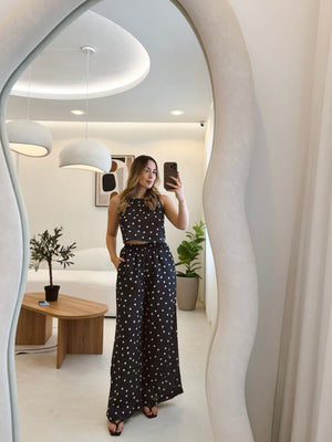 Este set de dos piezas es la combinación perfecta entre comodidad y estilo. Su diseño con un estampado exclusivo aporta un aire moderno y vibrante, ideal para quienes buscan destacar con un look único. Úsalo con sandalias para un look cómodo y casual o con tacones para una versión más sofisticada.