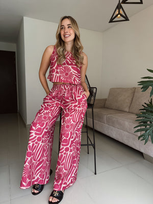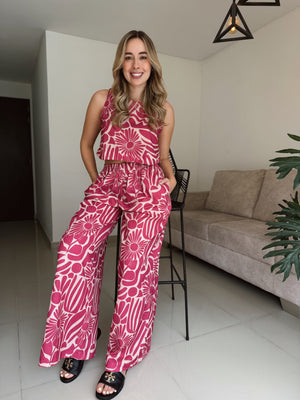Este set de dos piezas es la combinación perfecta entre comodidad y estilo. Su diseño con un estampado exclusivo aporta un aire moderno y vibrante, ideal para quienes buscan destacar con un look único. Úsalo con sandalias para un look cómodo y casual o con tacones para una versión más sofisticada.