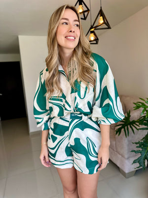 Este set de camisa y short es perfecto para quienes buscan comodidad sin perder el toque chic. Es la combinación perfecta entre minimalismo y originalidad. Su estampado le da un aire moderno y sofisticado.