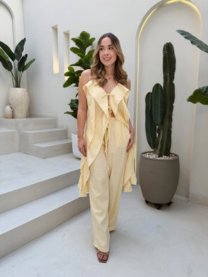 Este set está compuesto por un top de tirantes delgados con escote en V, detalle de amarre frontal ajustable y volantes en capas que aportan movimiento y un look femenino y sofisticado.