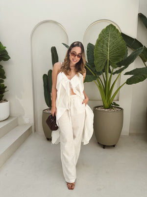 Este set está compuesto por un top de tirantes delgados con escote en V, detalle de amarre frontal ajustable y volantes en capas que aportan movimiento y un look femenino y sofisticado.