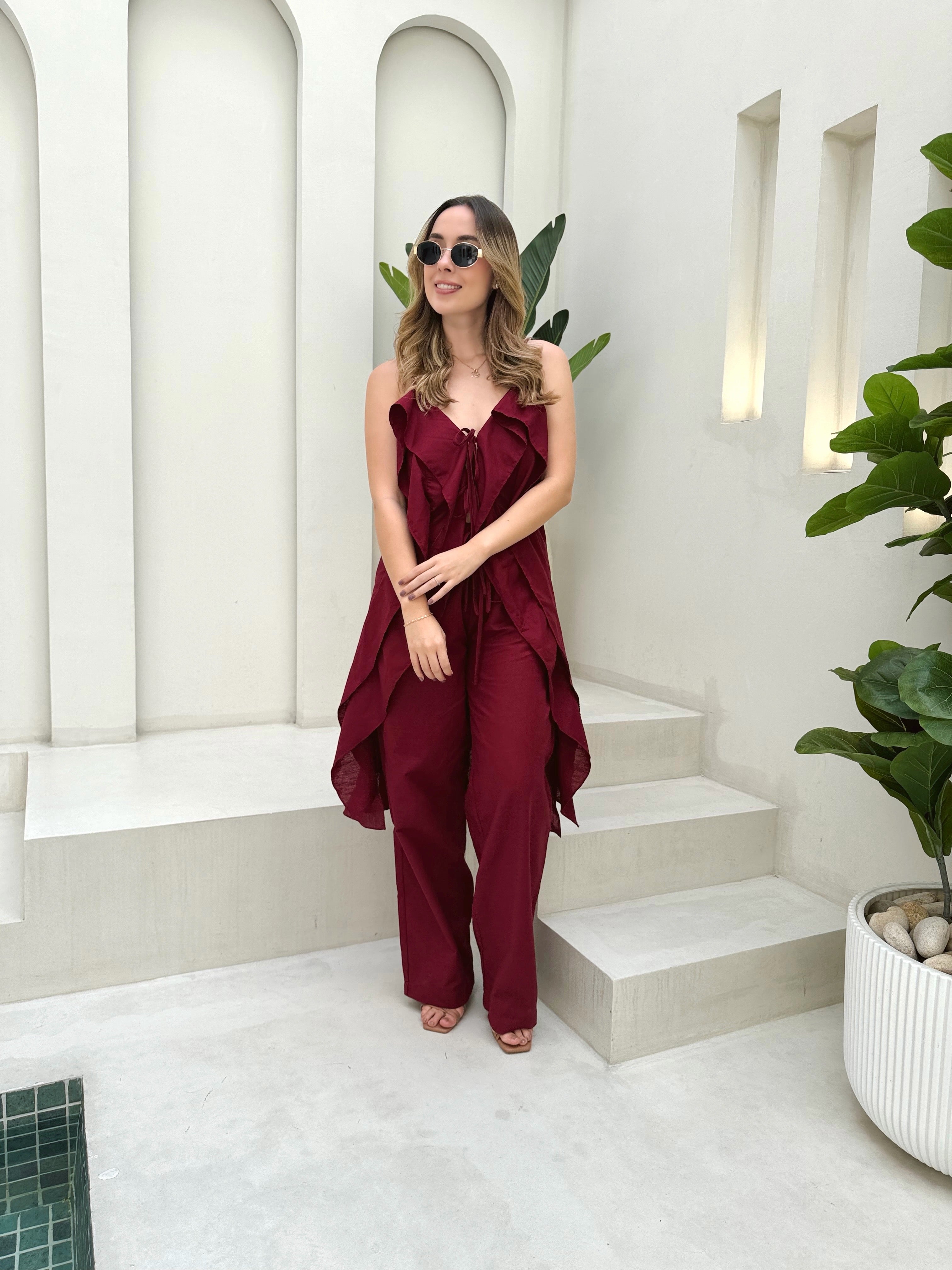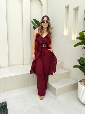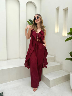 Este set está compuesto por un top de tirantes delgados con escote en V, detalle de amarre frontal ajustable y volantes en capas que aportan movimiento y un look femenino y sofisticado.