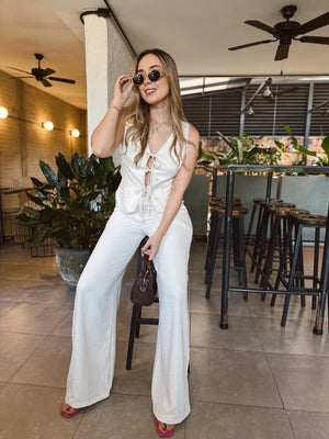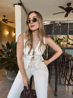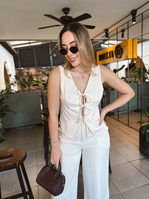✔Top tipo chaleco con escote en V y amarre frontal con lazos, que aporta un toque sensual y femenino
