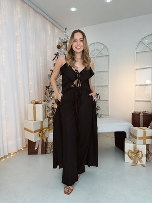 Este set está elaborado en una tela tipo lino suave y ligera, perfecta para lograr un look fresco y sofisticado. El top cuenta con tirantes delgados, escote en V y un detalle de amarre frontal que añade un toque femenino. Además, incorpora volantes amplios que caen de forma fluida, creando movimiento y estilizando la silueta.