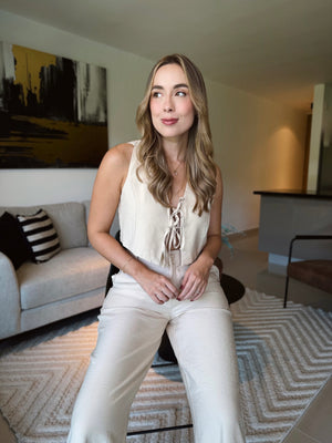 Este delicado set en tono beige está confeccionado en una tela rayón. El chaleco corto sin mangas presenta un escote en V con detalle de amarre frontal ajustable, que añade un toque femenino y permite adaptar el ajuste al cuerpo.