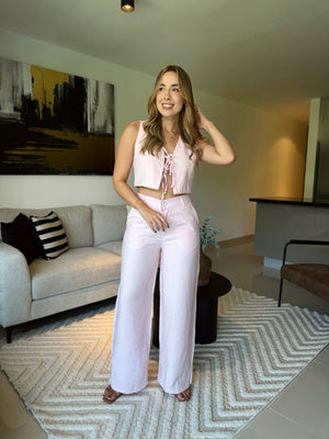 Este delicado set en tono rosa pastel está confeccionado en una tela rayón. El chaleco corto sin mangas presenta un escote en V con detalle de amarre frontal ajustable, que añade un toque femenino y permite adaptar el ajuste al cuerpo.