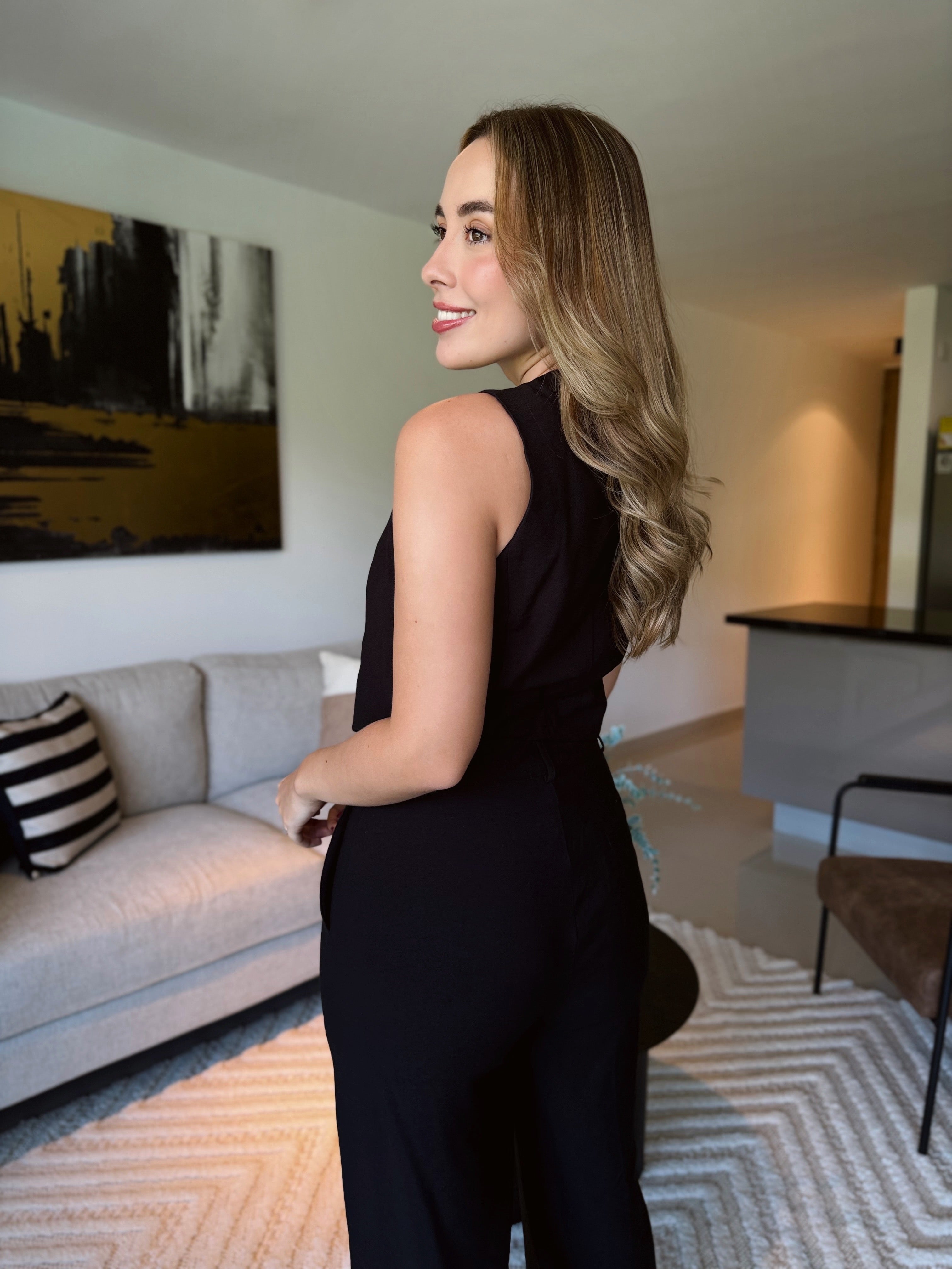 Este set en color negro está confeccionado en una tela rayón fresca y de textura suave, ideal para climas cálidos y looks sofisticados. El chaleco sin mangas presenta un diseño cruzado tipo wrap, con escote en V.
