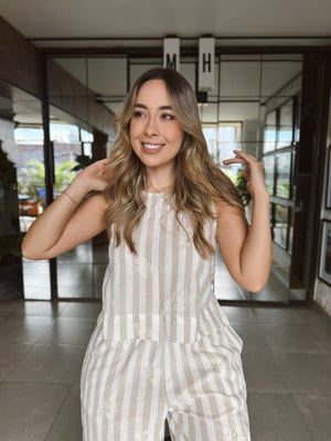 Set de dos piezas en lino ligero con estampado de rayas verticales, decorado con delicados bordados florales que le dan un toque artesanal y femenino.