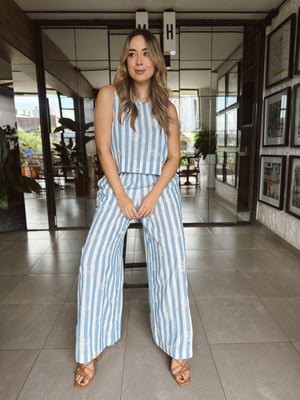 Set de dos piezas en lino ligero con estampado de rayas verticales, decorado con delicados bordados florales que le dan un toque artesanal y femenino.