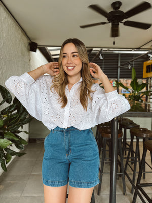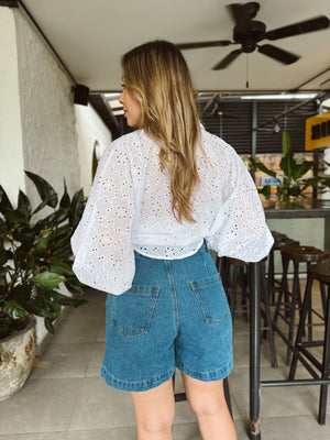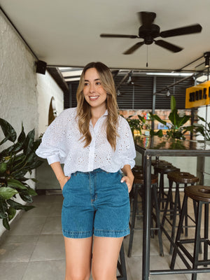 Short en denim azul de tiro alto, con diseño clásico y silueta recta que brinda comodidad y estilo. Su largo medio lo hace versátil para combinar en looks casuales y frescos. Ideal para usar con blusas ligeras o camisetas básicas, perfecto para días soleados o salidas informales.