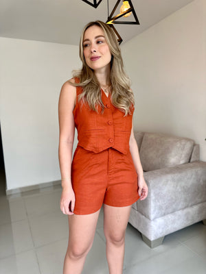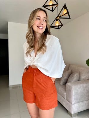 Short elaborado en lino con bolsillos frontales, tiro alto.