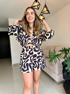 Crop top de manga enteriza, con tres formas de uso, en seda estampada y manga terminada en caucho.