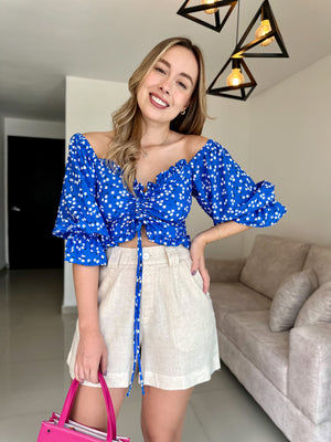 Esta blusa con estampado de pequeñas flores blancas es perfecta para darle un toque fresco y femenino a tu outfit. Su diseño con mangas abullonadas y detalle de fruncido en el centro resalta la figura de manera favorecedora.