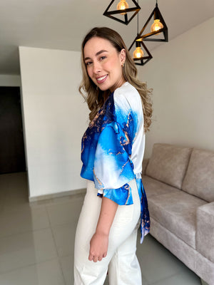 Dale un toque sofisticado y vibrante a tu look con esta elegante blusa satinada, que destaca por su hermoso estampado marmoleado.
