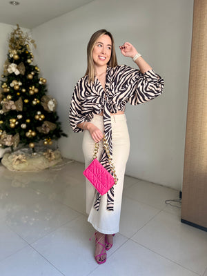 Este hermoso top es la pieza ideal para un look fresco y elegante. Su diseño de mangas amplias y fluidas le da un aire sofisticado, mientras que el nudo frontal permite un ajuste favorecedor y moderno. Está confeccionada en una seda ligera, perfecta para mantener la comodidad sin perder el estilo.