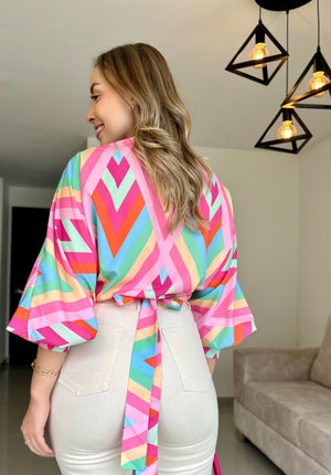 Este hermoso top es la pieza ideal para un look fresco y elegante. Su diseño de mangas amplias y fluidas le da un aire sofisticado, mientras que el nudo frontal permite un ajuste favorecedor y moderno. Está confeccionada en una seda ligera, perfecta para mantener la comodidad sin perder el estilo.