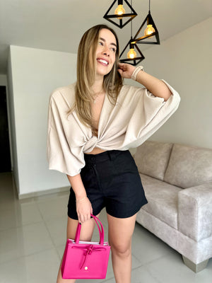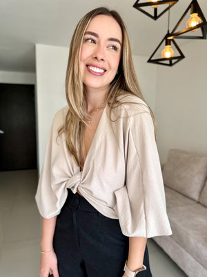 Este hermoso top es la pieza ideal para un look fresco y elegante. Su diseño de mangas amplias y fluidas le da un aire sofisticado, mientras que el nudo frontal permite un ajuste favorecedor y moderno. Está confeccionada en una seda ligera y texturizada, perfecta para mantener la comodidad sin perder el estilo.