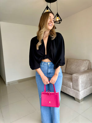 Este hermoso top es la pieza ideal para un look fresco y elegante. Su diseño de mangas amplias y fluidas le da un aire sofisticado, mientras que el nudo frontal permite un ajuste favorecedor y moderno. Está confeccionada en una seda ligera y texturizada, perfecta para mantener la comodidad sin perder el estilo.