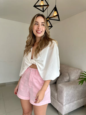 Este hermoso top es la pieza ideal para un look fresco y elegante. Su diseño de mangas amplias y fluidas le da un aire sofisticado, mientras que el nudo frontal permite un ajuste favorecedor y moderno. Está confeccionada en una seda ligera y texturizada, perfecta para mantener la comodidad sin perder el estilo.