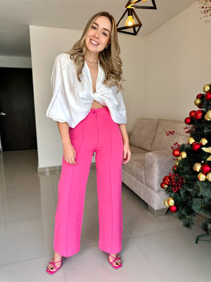 Este hermoso top es la pieza ideal para un look fresco y elegante. Su diseño de mangas amplias y fluidas le da un aire sofisticado, mientras que el nudo frontal permite un ajuste favorecedor y moderno. Está confeccionada en una seda brillante, perfecta para mantener la comodidad sin perder el estilo.