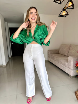 Este hermoso top es la pieza ideal para un look fresco y elegante. Su diseño de mangas amplias y fluidas le da un aire sofisticado, mientras que el nudo frontal permite un ajuste favorecedor y moderno. Está confeccionada en una seda brillante, perfecta para mantener la comodidad sin perder el estilo.