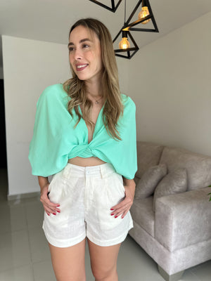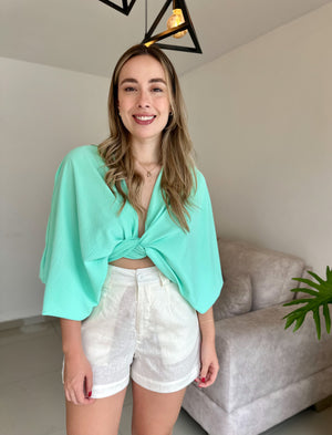 Este hermoso top es la pieza ideal para un look fresco y elegante. Su diseño de mangas amplias y fluidas le da un aire sofisticado, mientras que el nudo frontal permite un ajuste favorecedor y moderno. Está confeccionada en una seda ligera y texturizada, perfecta para mantener la comodidad sin perder el estilo.